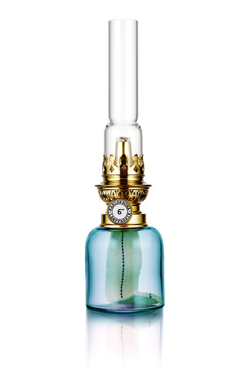 N243A3: Fotogenlampa i akvamarint klarglas.